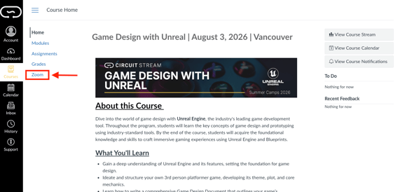 - In your course, click on the Zoom tab, which can be found in the white navigation bar on the left of your screen.