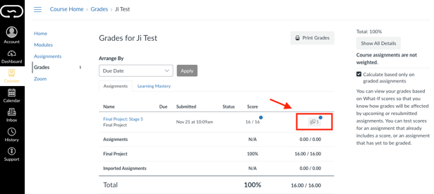 - Once in the Grades section, you will see all of your grades/progress in the course. To view the instructor's feedback, simply press the message icon next to your score.