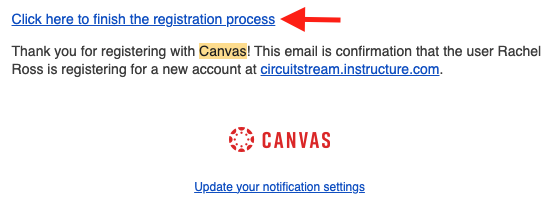 After enrollment, you will receive an activation email for the Circuit Stream Learning Management System (LMS) from notifications@instructure.com titled 'Confirm Registration: Canvas'. The email will include instructions for setting up your account.